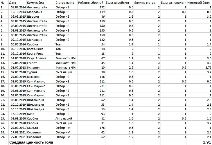 Спасибо за интерес к предыдущему посту, ваши комментарии (нет ни одного негативного, это удивительно и приятно). Вы подали мне несколько идей продолжить исследование, а именно рассчитать ценность голов с учетом коэффициента за пенальти и посчитать статистику по другим голеадорам сборной России.