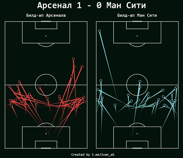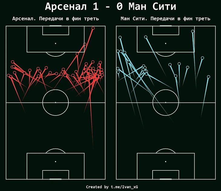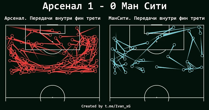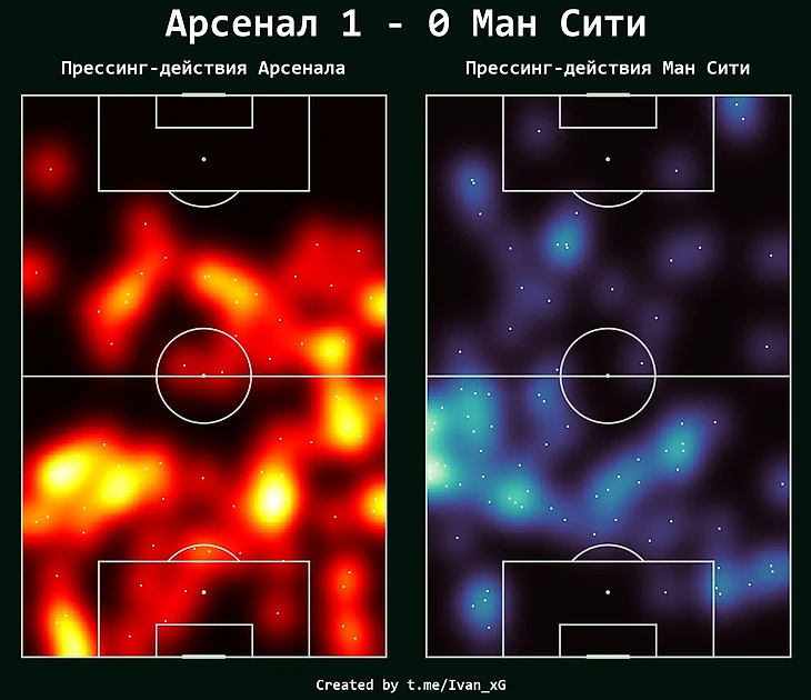 На карте прессинг-действий видно насколько активно "Арсенал" оборонялся даже на чужой половине. Это подтверждает и высчитанная интенсивность прессинга, PPDA40 Арсенала (количество передач соперника в 40% от их ворот на одно прессинг-действие) составлял 9.4, "Манчестер Сити" - 14.5.