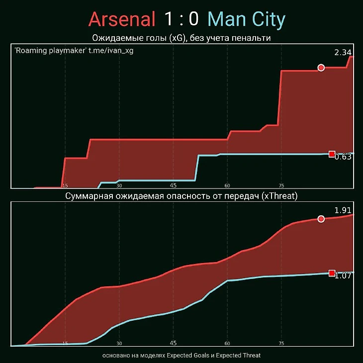 Насколько же опасным было это давление и доминирование нам помогут оценить современные метрики xG (ожидаемая угроза от удара) и хТ (ожидаемая угроза от передачи), за подсчет которых я благодарю проект "Футбол в цифрах"