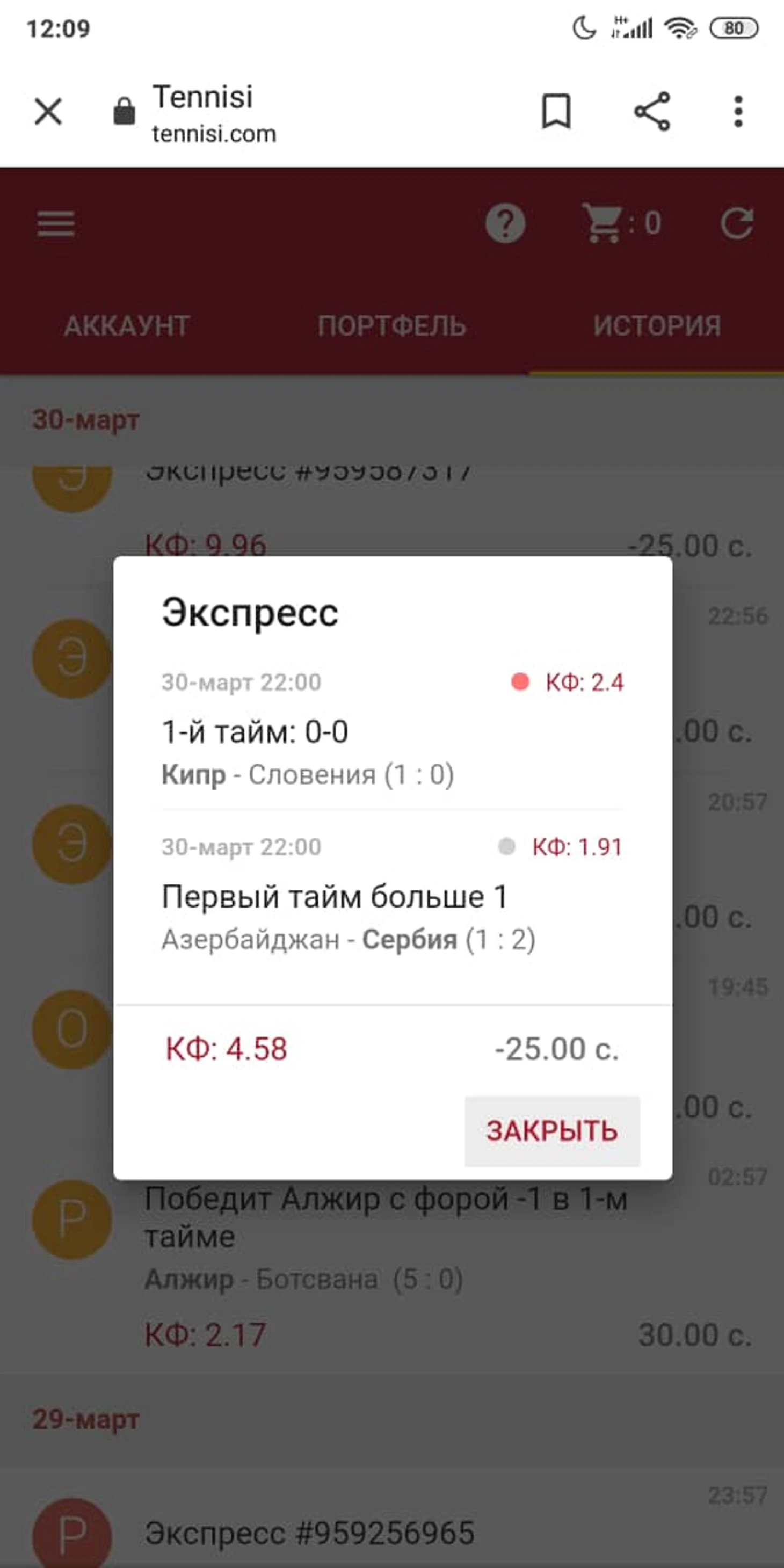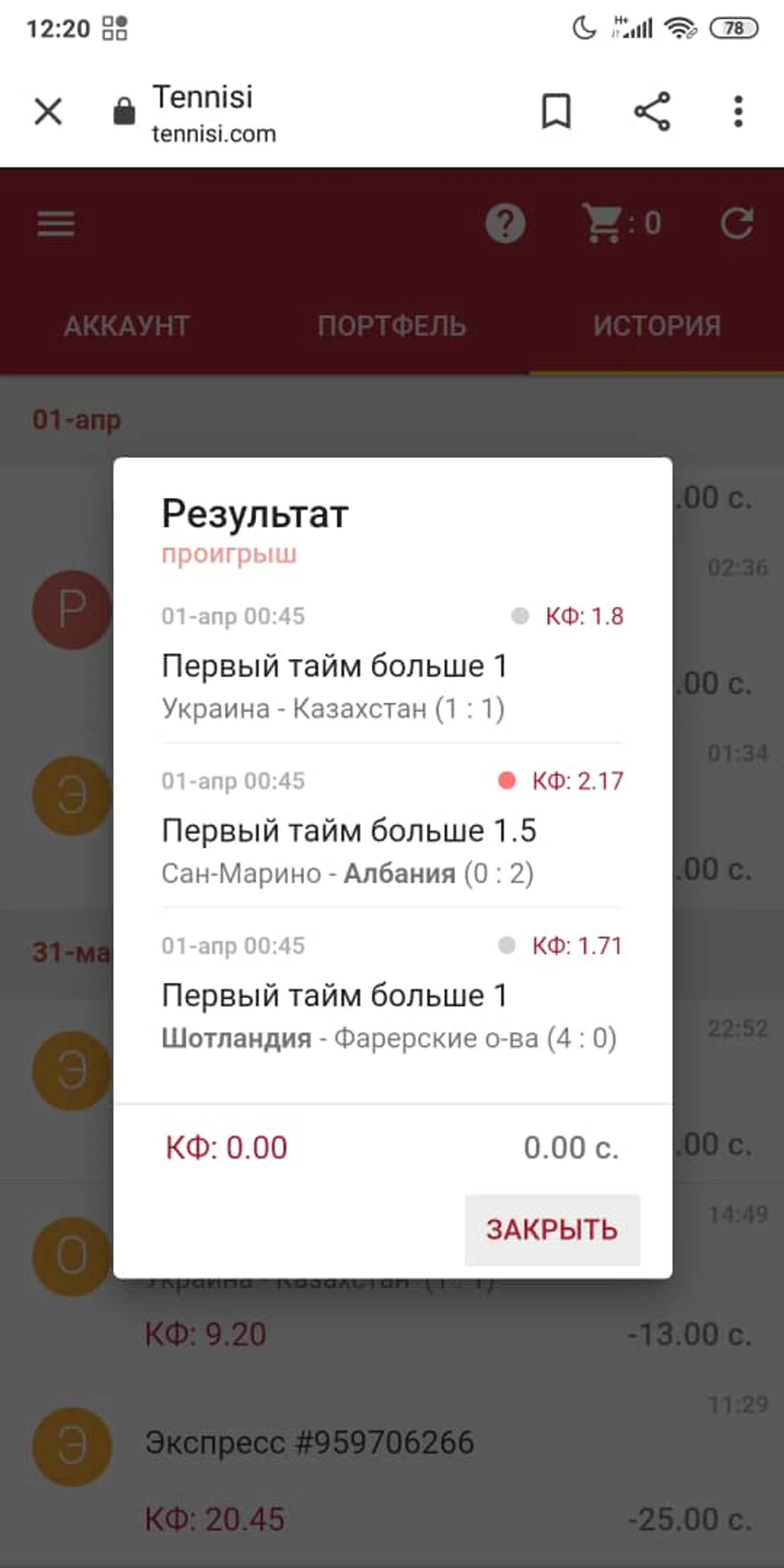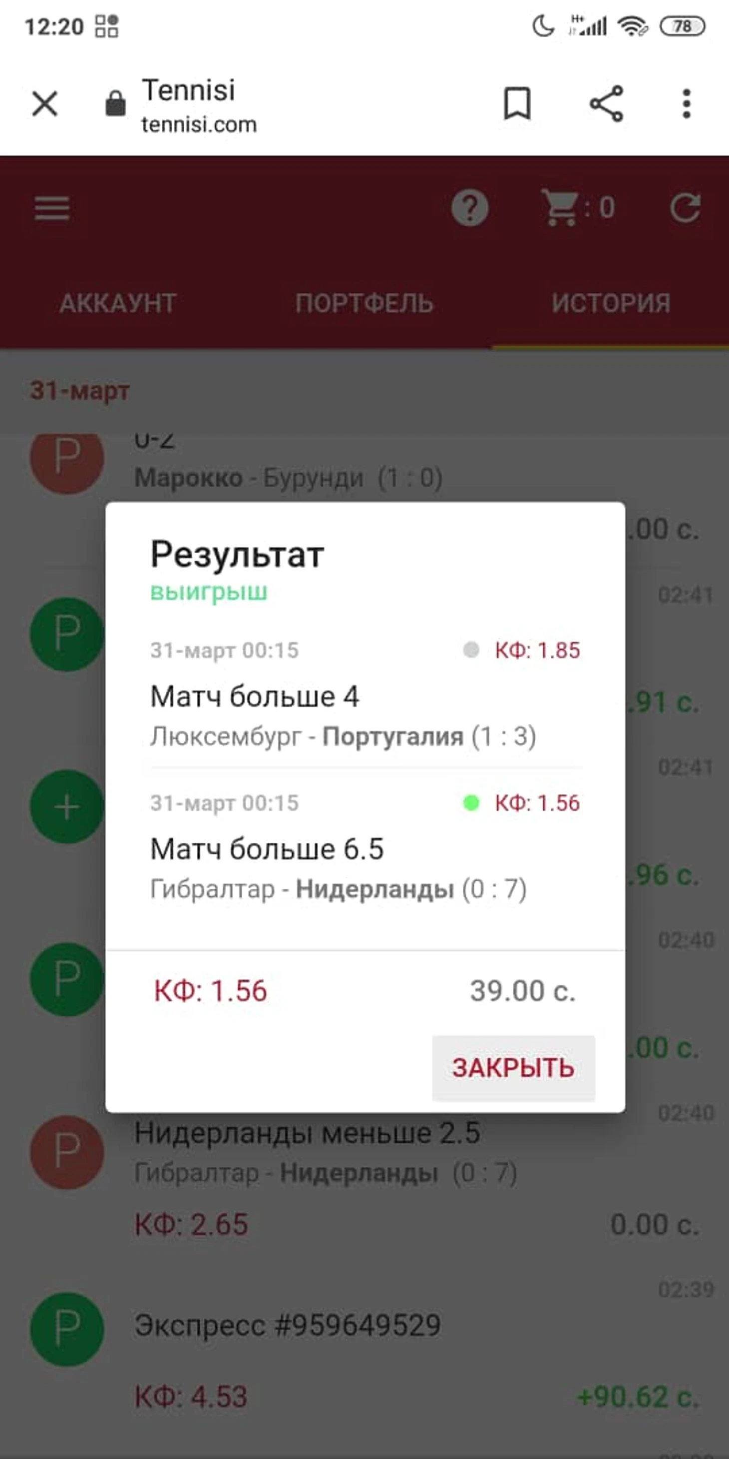 30 марта я начал со ставки на точный счёт. Ставка просто нелогичная и не поддается никакому объяснению, но оно у меня есть. Откуда взялась такая ставка? Её я снова подсмотрел у пользователей коэффициентного сервиса, с помощью которого, можно зная коэффициенты, суметь предсказать какой либо результат матча, на основе его коэффициентов. Но с выбором я точно ошибся. Матч закончился 1:0 в пользу Марокко. И ставил на это чисто символические 13 у.е.