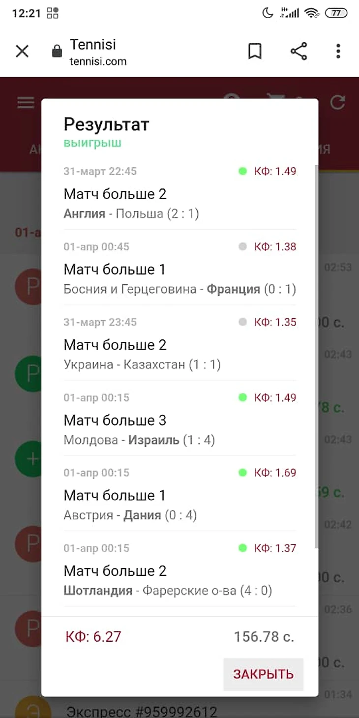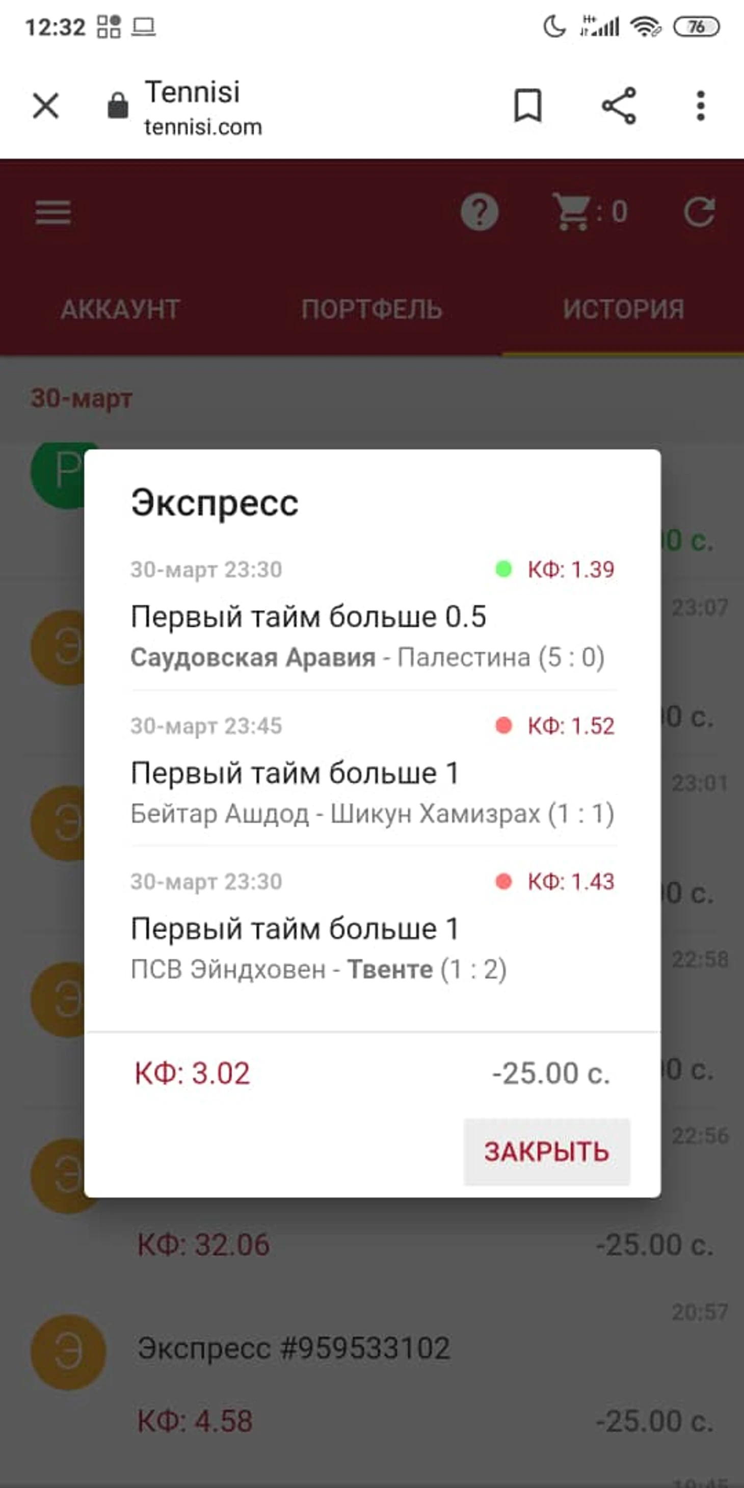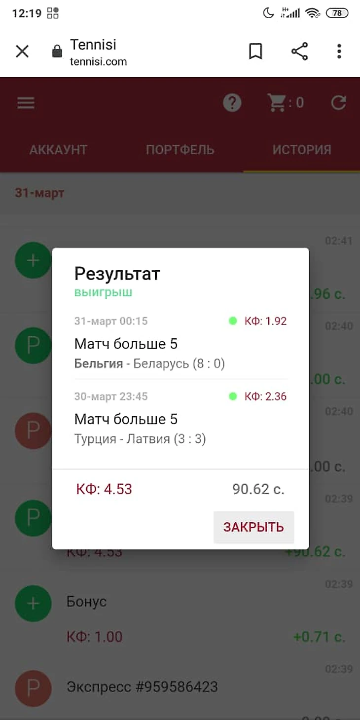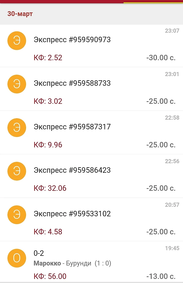 30 марта я начал со ставки на точный счёт. Ставка просто нелогичная и не поддается никакому объяснению, но оно у меня есть. Откуда взялась такая ставка? Её я снова подсмотрел у пользователей коэффициентного сервиса, с помощью которого, можно зная коэффициенты, суметь предсказать какой либо результат матча, на основе его коэффициентов. Но с выбором я точно ошибся. Матч закончился 1:0 в пользу Марокко. И ставил на это чисто символические 13 у.е.