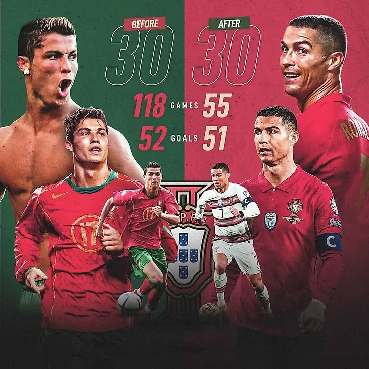 Результативность Криштиану Роналду за сборную Португалии до и после 𝟛𝟘 лет