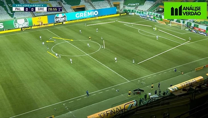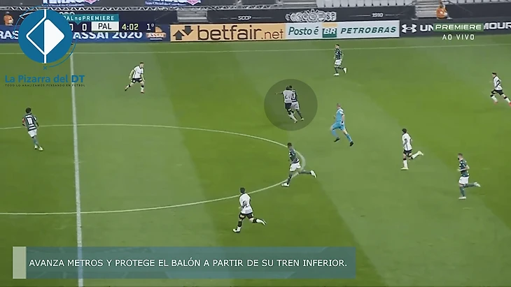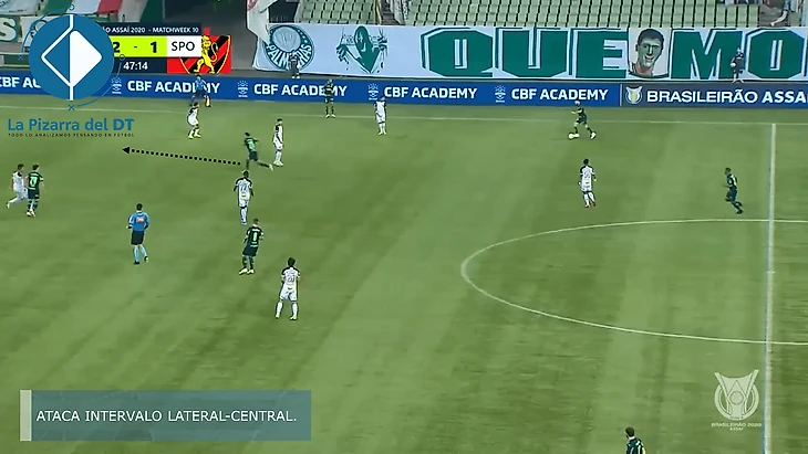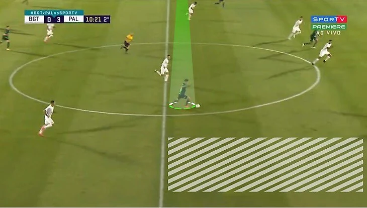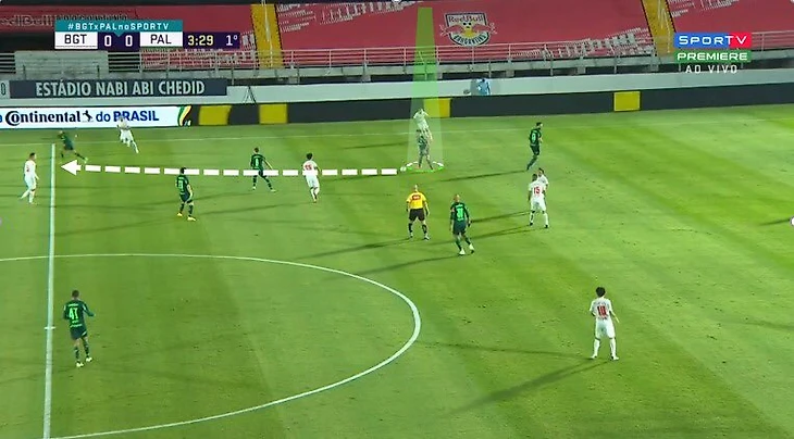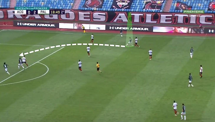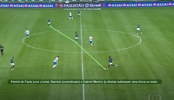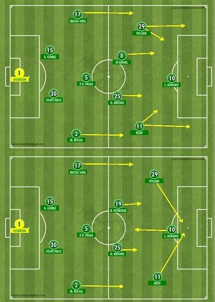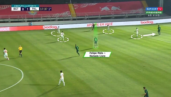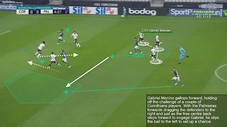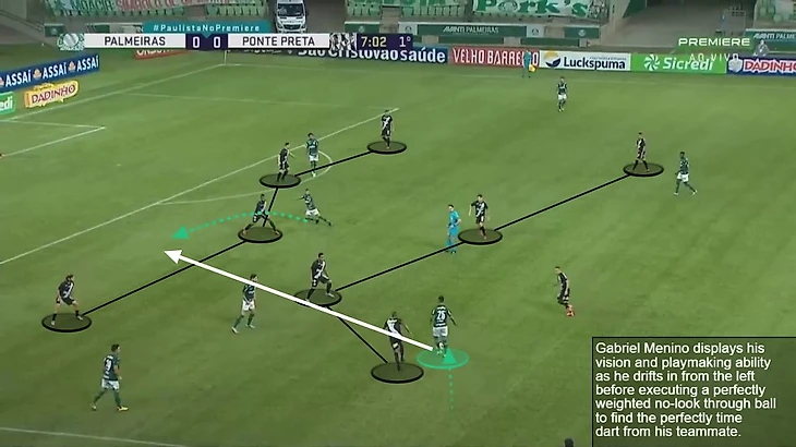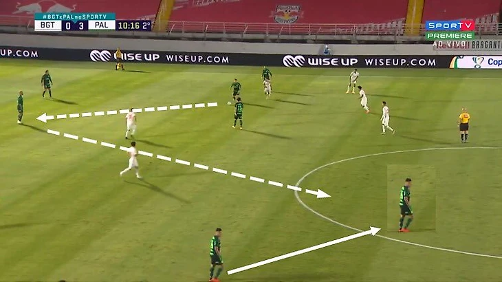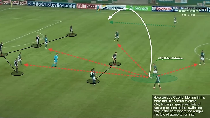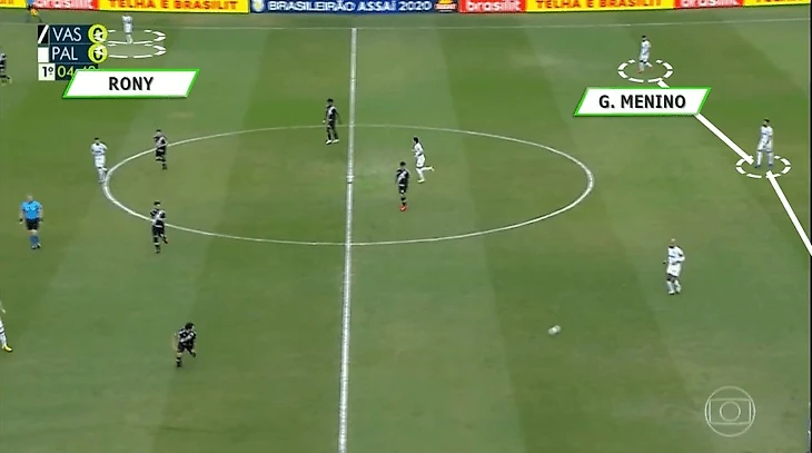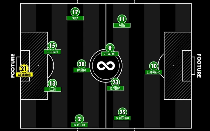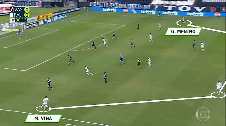 Опытный Маркос Роша лишь номинально правый латераль,по факту «Палмейрас» по ходу матча перестраивается от 3-4-2-1 (с Рошей в качестве правого загейро) до классических 4-1-4-1 и 4-4-2. И ключевая роль в этих ситуативных перестроениях принадлежит Менино и Винье.