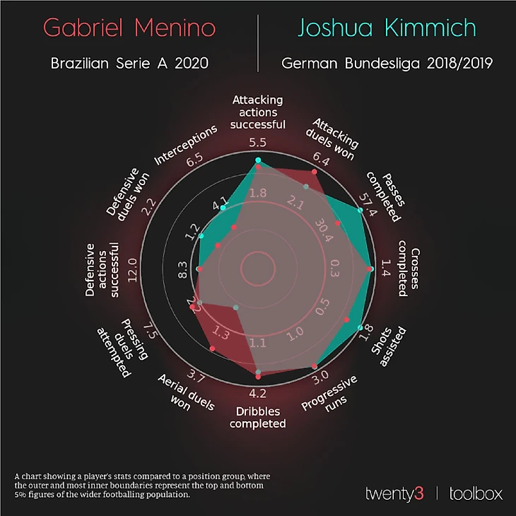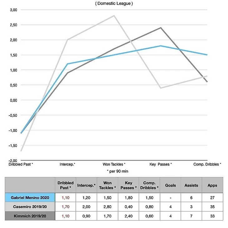 Менино в среднем 1,3 кросса против 1,4 у Киммиха. Прогрессивные проходы – 2,7 у Менино, 3,0 у Киммиха), успешные обводки – 4,2 у Менино, 3,9 у Киммиха, успешные оборонительные действия – 8,0 у Менино, 8,2 у Киммиха), успешные «атакующие действия – 5,2 у Менино, 5,3 у Киммиха.