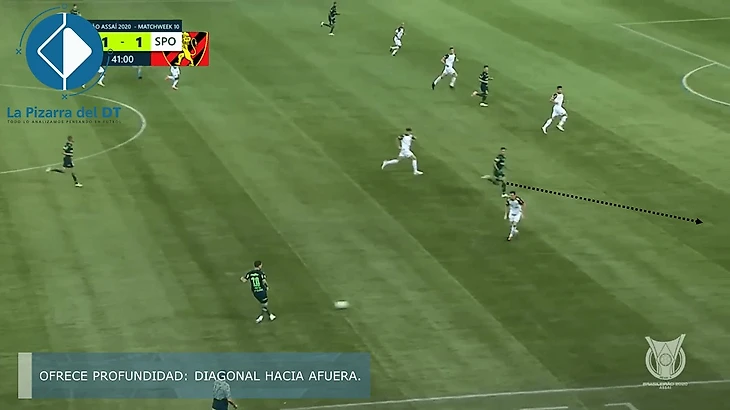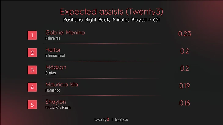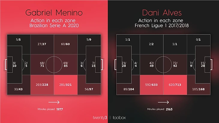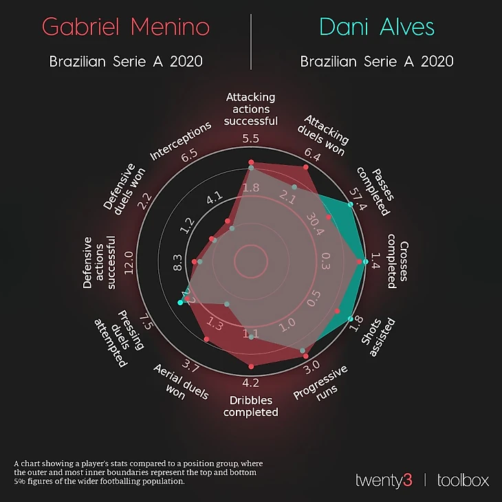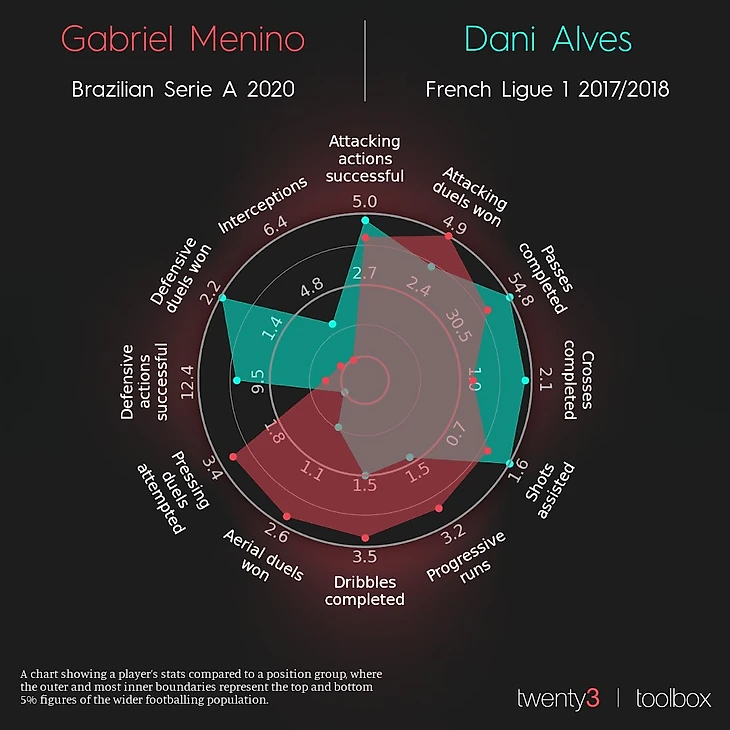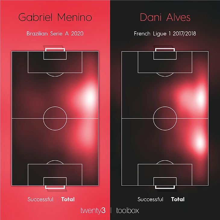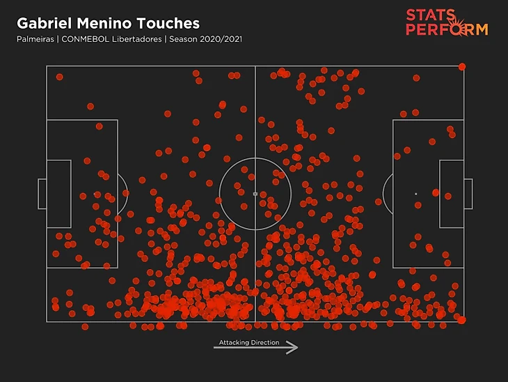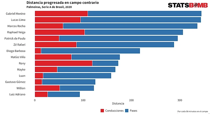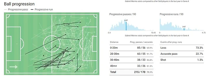 Менино выполняет функции одного из разыгрывающих из глубины, и в этом он очень хорош – не только потому что отлично двигает мяч вперед сам (и пасами с точностью 84,4%, и на ведении), но и быстро двигает мяч поперек, что является очень важным качеством для команды. Быстрота движения мяча в первой линии определяет игру команды, которая строит свой футбол через розыгрыш низом в полуфлангах. У Менино 9,69 атакующих действий за матч, только у одноклубника Скарпы выше, если мы берем полузащитников Бразилейрао. Да и по количеству продвижений мяча на ведении-2,67- он также в топе Бразилейрао.