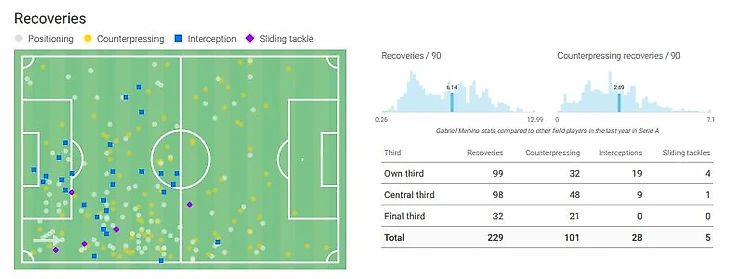 У Менино весьма качественный отбор – он сочетает силу с чтением игры. При этом он всегда старается занять изначально оптимальную позицию, чтобы в случае проброса мимо себя хотя бы контролировать зону, а в случае ухода под себя – выставить ногу и выбить мяч. Это особенно важное качество при интенсивном контрпрессинге и прессинге, где соперники часто выходят из обороны с трудом, и когда особенно важно иметь игрока типажа Менино, который будет окончательно устанавливать контроль.