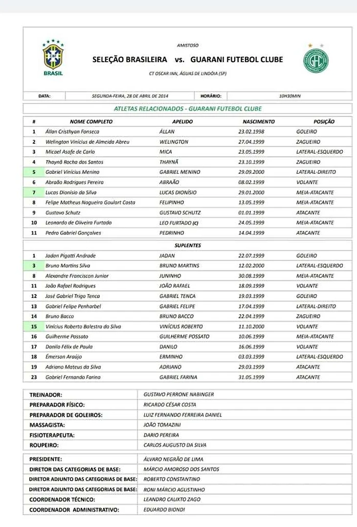 Селесао U-15 (2000 года рождения) приезжала на спарринг к «Гуарани» и разделала местных под орех 4-0. Но дуэли Винисиуса Жуниора с Менино не получилось, фламенгиста от страха ушел на другой фланг, чтобы не встречаться с Менино. Так со смехом вспоминает Густаво.