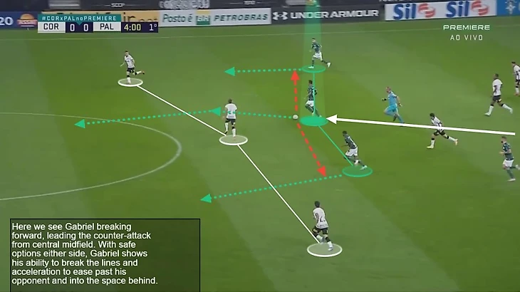 Именно агрессивность продвижения мяча, установка на сложный вертикальный пас и поиск нестандартных сложных решений из глубины – главная особенность игрока. Влияет и удивительная смелость: даже не имея сразу варианта впереди, Габриэл может двигаться с мячом, ожидая их появления.