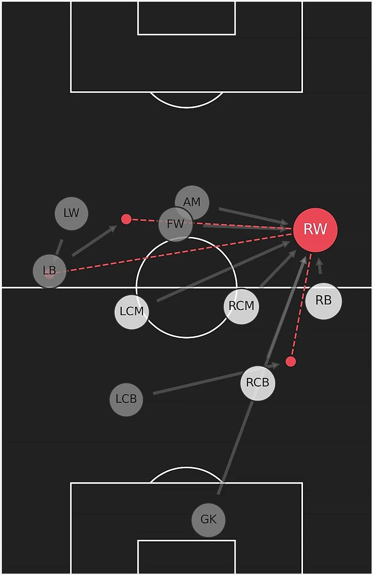 В атаке он даёт несколько важных опций. Во-первых, отличное сохранение владения. Блестящий для своих лет уровень принятия решений под давлением, очень хороший короткий пас с обеих ног, преимущественно аккуратное владение без рискованных пробросов и необязательных обводок, ведение обеими ногами плюс хороший корпус, хорошее движение и открывание под стенку или в свободную зону для сохранения владения.