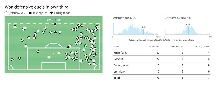 Карта выигранных единоборств в своей трети. Разброс от правого фланга до зоны 14 обусловлен универсализмом Габриэла-игрой в течение сезона минимум на трех позициях.