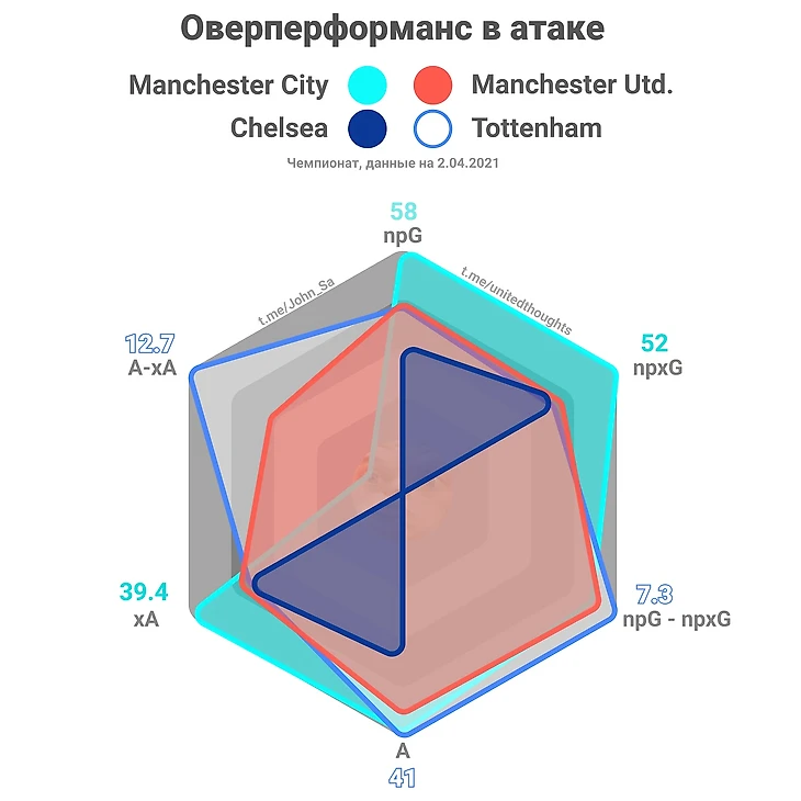Из такой разницы следует, что «Юнайтед» забивает прилично больше, чем создаёт. Если сравнить разницу npG-npxG у «Тоттенхэма» (7,3) и «Челси» (-4,1), цифры вполне гармонируют с впечатлениями от игры команд.