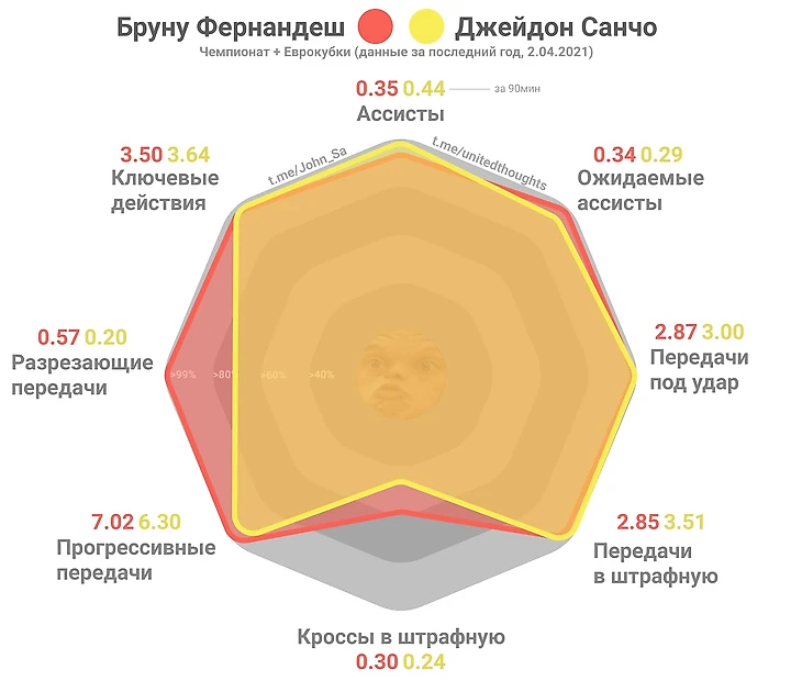 В целом, «креативные» профили Бруну и Санчо очень похожи, Джейдон всегда приоритезирует передачу в ситуациях, когда это действительно лучший вариант для продолжения атаки. Можно только догадываться, насколько сильным может быть эффект от приобретения такого футболиста. Ещё свежи воспоминания, как приход Бруну перевернул сезон «Юнайтед» 19/20 и превратил его из провального в… удобоваримый.