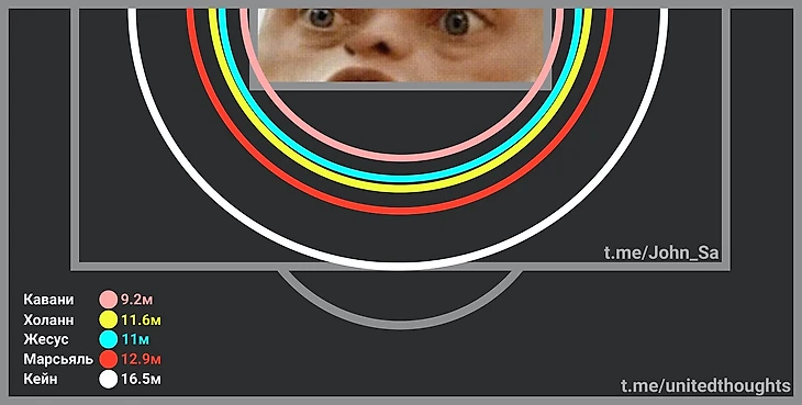 В этом плане Марсьяль сильно отстаёт от Кавани — уругваец гораздо лучше двигается и предлагает себя в штрафной, потому чаще из неё бьёт. Среднее расстояние до ворот в момент удара у Эдинсона 9,23 м, а у Марсьяля — 12,9 м.