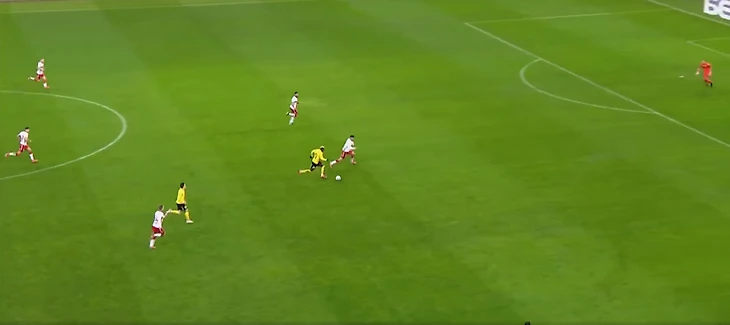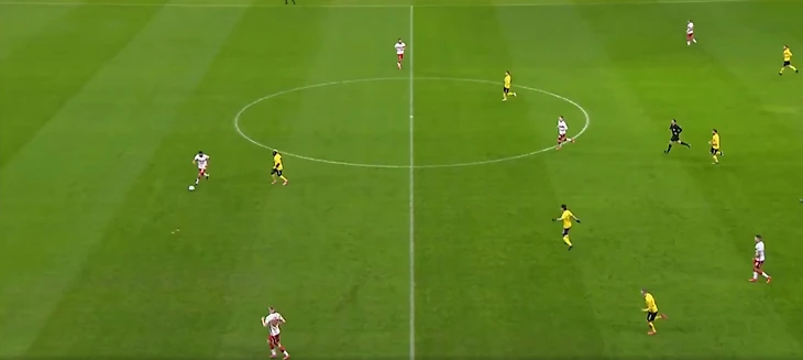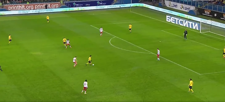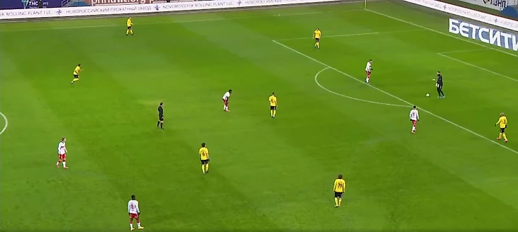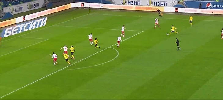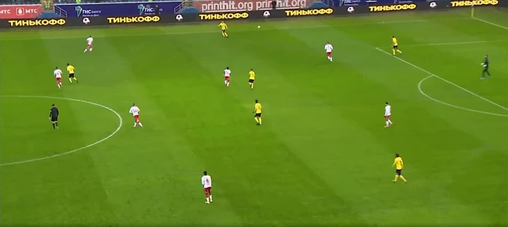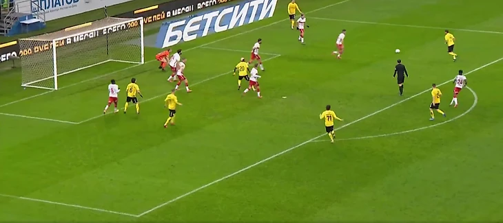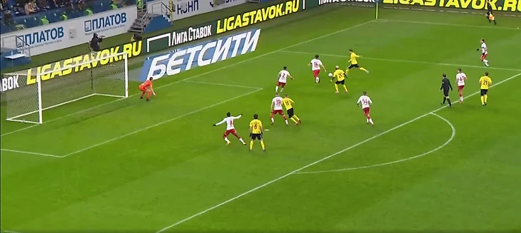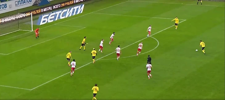 Опорная зона страдала не только во время пропущенного мяча, провалы на месте Зобнина и Умярова возникали не единожды. Например, на следующем скрине можно увидеть ещё один момент, где Махатадзе оказался один на пространстве и пробил по воротам. Умяров занял место центрального защитника, Маслов смещался в центр, но не успел, как и Зобнин, возвращавшийся из атаки.