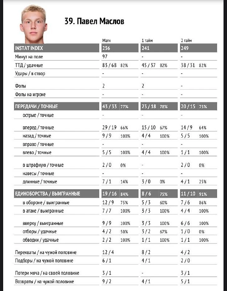 Ещё один игрок, получающий незаслуженную критику за свою игру – Маслов. Паша провёл отличную игру, на 100% выполнив установку Тедеско (о ней – чуть позднее). 77% удачных передач, с учётом, что Паша был самым пасующим защитником, через которого мяч зачастую доставлялся в атаку, 84% выигранных единоборств, 12 перехватов, 82% удачных действии – отличные показатели для молодого защитника «Спартака».