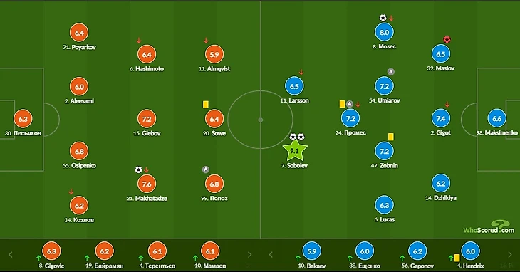 Ещё один игрок, помимо Соболева и Маслова, достойный получить порцию похвалы – Виктор Мозес. Кажется, Тедеско нашел баланс для гармоничного использования нигерийца в команде. Его недостатки в обороне нейтрализует Маслов, а Виктор занимается больше атакующей работой. Забитый мяч (похожий на мяч в ворота «Динамо»), 2 удачных обводки, 3 ключевых передачи, 6 передач с продвижением, 11 - на чужой трети, 3 удара в створ. Великолепный перфоманс от бывшего игрока «Челси». Чуть хуже на его фоне выглядел Айртон, которому явно не хватает чаще включать голову, дабы его попытки дриблинга, обострения и подач заканчивались более успешно (благо, техника у бразильца отличная).