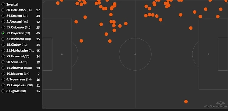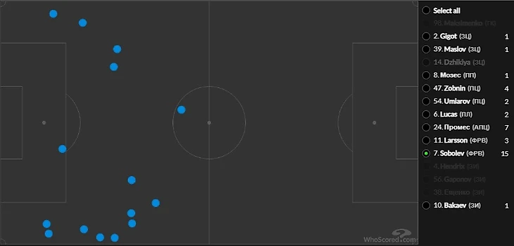 Соболев выделился по потерям мяча - целых 15 раз, что оправдывается большим количеством борьбы за мяч после дальних передач и невероятной вовлечённостью форварда в игру.