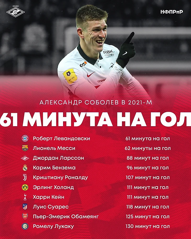 А вот в выигранной борьбе в воздухе - Саша король со знаком плюс. Целых 12 дуэлей выиграно – больше, чем у всей обороны «Ростова». Также, официальные каналы «Спартака» привели интересную статистику – количество минут на 1 забитый мяч, по которой Соболев является одним из лучших нападающих Европы на данный момент. Покажите данную таблицу главному тренеру одной сборной.