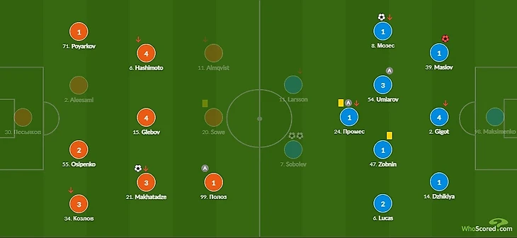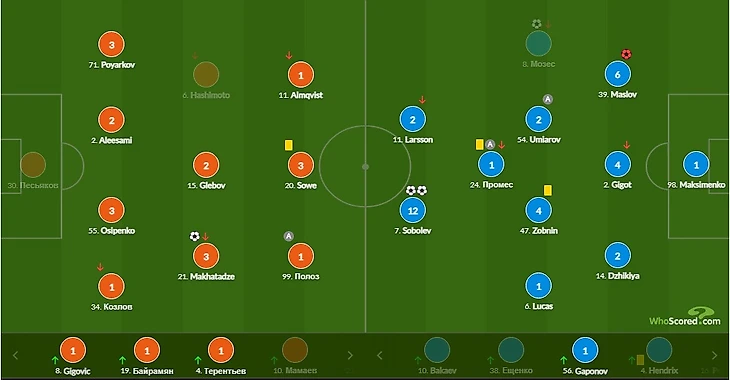 Что касается «Спартака», то базис игры оставался тем же, что и в прошедших играх – вертикальность, прессинг, активность латералей, Соболев в качестве притягателя мяча и креативные Ларссон и Промес как инструмент расшатывания обороны противника. Швед провёл относительно самого себя средний матч, но не лучшую игру Джордана компенсировал Соболев.