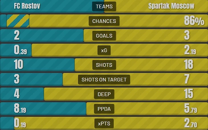PPDA также полностью на стороне «красно-белых», команда показала куда более интенсивный прессинг, нежели «Ростов», что подтверждается, например, состоянием Соболева в конце, который еле стоял на ногах.