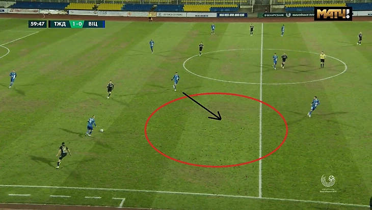 Здесь команда располагается максимально широко, растягивая тем самым плотное построение «Торпедо» в центре поля. Благодаря этому, удаётся высвободить достаточно большой кусок пространства, на который смещается Каленчук.