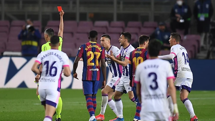 Последним на поле выходила «Барселона». Матч против «Вальядолида» должен был стать легкой прогулкой, учитывая то, что гости приехали в столицу Каталонии лишившись дюжины игроков основы. Каталонцы понимали, что в случае успеха они сократят отставание от «Атлетико» до одного очка, что должно было стать главное мотивацией этого матча, в котором Лионель Месси и Френки де Йонг были на грани дисквалификации. Оба игрока подошли к матчу, имея по четыре желтые карточки в своём активе, а дисквалификация полагается за каждую пятую карточку. Казалось, что накануне матча с «Реалом», который будет в следующем туре, Куман не станет рисковать лидерами команды, но важность победы оказалась важней, и мы увидели двух игроков в стартовом составе. Оба игрока с предельной осторожностью действовали в каждом моменте матча, что не могло не сказаться. Каждому из них не хватало резкости, наглости и дерзости, которые зачастую граничат с риском получить жёлтую карточку, и как кажется, возможно, стоило их оставить на скамейке запасных или же, зная, что у них по четыре карточки, постараться получить карточки ранее, чтобы пропускать отчетный матч против «Вальядолида». Но этого не было сделано. Болельщики уже стали привыкать к тому, что матчи национального первенства после пауз на игры сборных зачастую получаются не самыми лучшими. И этот матч был одним из таковых. Матч запомнился очень странным судейством, когда арбитр сначала не заметил удар локте в лицо Гризманну, а потом и нарушение правил на Десте, которое было в пределах штрафной, а значит должно было сопровождаться назначением пенальти. Но все это осталось вне поля зрения судейской бригады. Но на этом судейство не оставляет вопросов. За десять минут до конца матча он увидел грубой нарушение на красную карточку в том моменте, когда красной карточки и близко не было. Так гости остались в меньшинстве, и в самом конце матча каталонцам удалось отправить мяч в ворота гостей. Усман Дембеле записал три очка в актив сине-гранатовых.