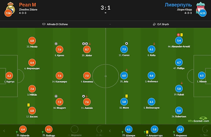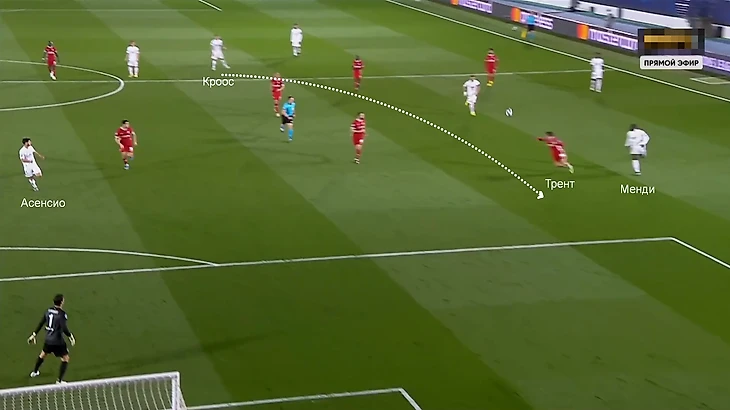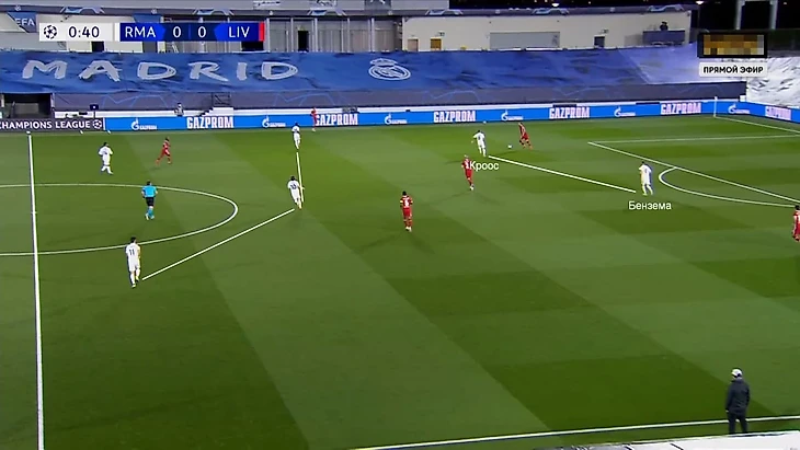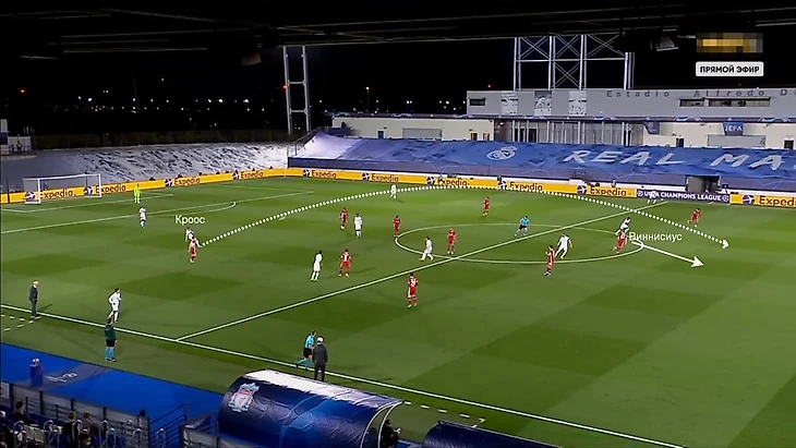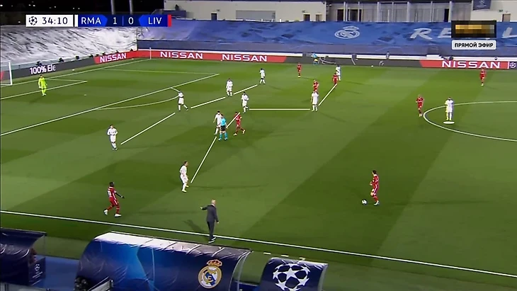 Всем прекрасно известно, что Ливерпуль Клоппа очень любит и умеет играть сдвоенными флангами: справа ТАА и Салах, слева Робертсон и Мане. Зидан решил подготовить для Юргена и его команды такие же сдвоенные фланги, но это были не просто сдвоенные фланги, а сдвоенные фланги с подстраховкой из центра. Справа сзади располагался Лукас Васкес, над ним Асенсио, но ему помогал Модрич, тоже самое было слева, - над Менди играли Винисиус и Кроос. Зидан сделал этот ход для того, чтобы полностью обезвредить Салаха и Мане на флангах. В таких ситуациях в центре поля оставался один Каземиро, он выступал в роли "волнореза", а также в роли игрока, закрывающего вариант передачи между линиями. Стоит отметить, что Карлос был на высоте, и со своими задачами точно справился на отлично.