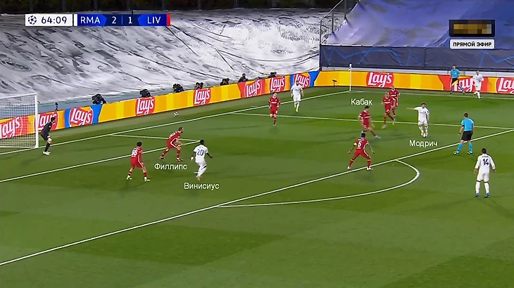 Во время этого забитого мяча уже стало ясно насколько в ужасном духе вышел Ливерпуль на эту игру. Модрич получил мяч в штрафной, и оказался в ситуации, где его опять никто не встречает, мяч под левой ногой, вряд ли он будет бить, но Кабак решает сместиться на него, оставляя за спиной огромное пространство, в которое бежит Винисиус и показывает рукой, когда катить мяч. Лука отдал передачу в свободное пространство, а Филлипс должен был накрыть этот удар, он должен был играть не по Жуниору, а по мячу, хоть прыгнуть в ноги Винисиусу, лишь бы не дать пробить, но Филлипс решил просто убрать руки за спину, и выставить вперед ногу, в надежде на то, что Бразилец попадет именно в нее. Мяч полетел плохо, практически по центру, Алиссон должен был брать такой, дай ему еще 10 таких ударов, он возьмет 9 из них, но вот именно этот он не взял.
