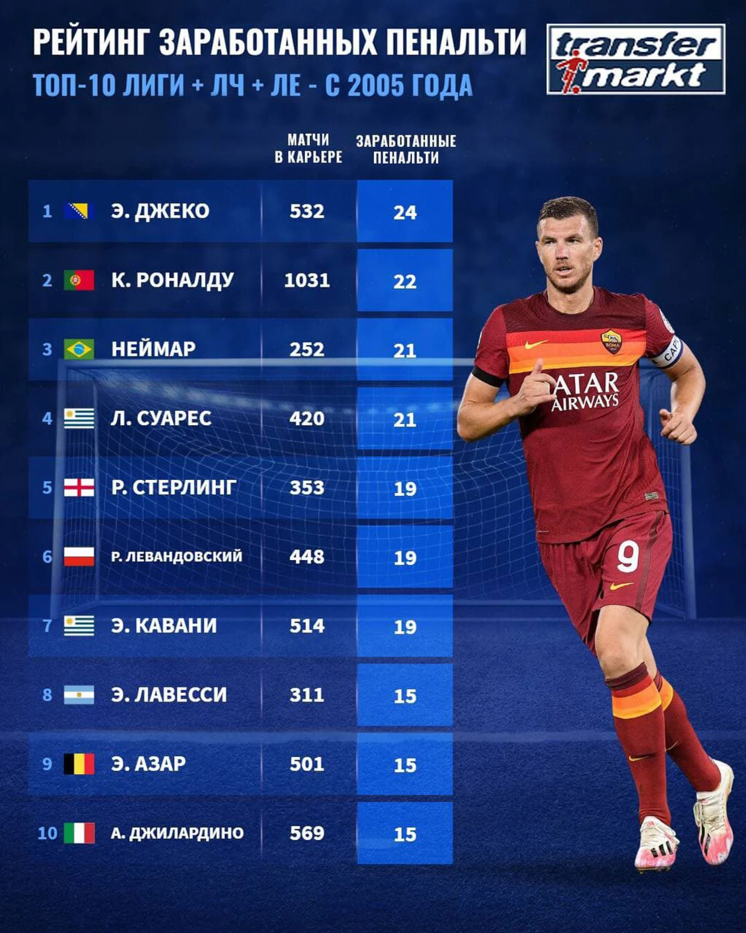 Игроки, которые являются авторами по наибольшему числу заработанных, а в последствии реализованных пенальти в матчах топ-10 чемпионатов, Лиги чемпионов и Лиги Европы/Кубка УЕФА с 2005 года.