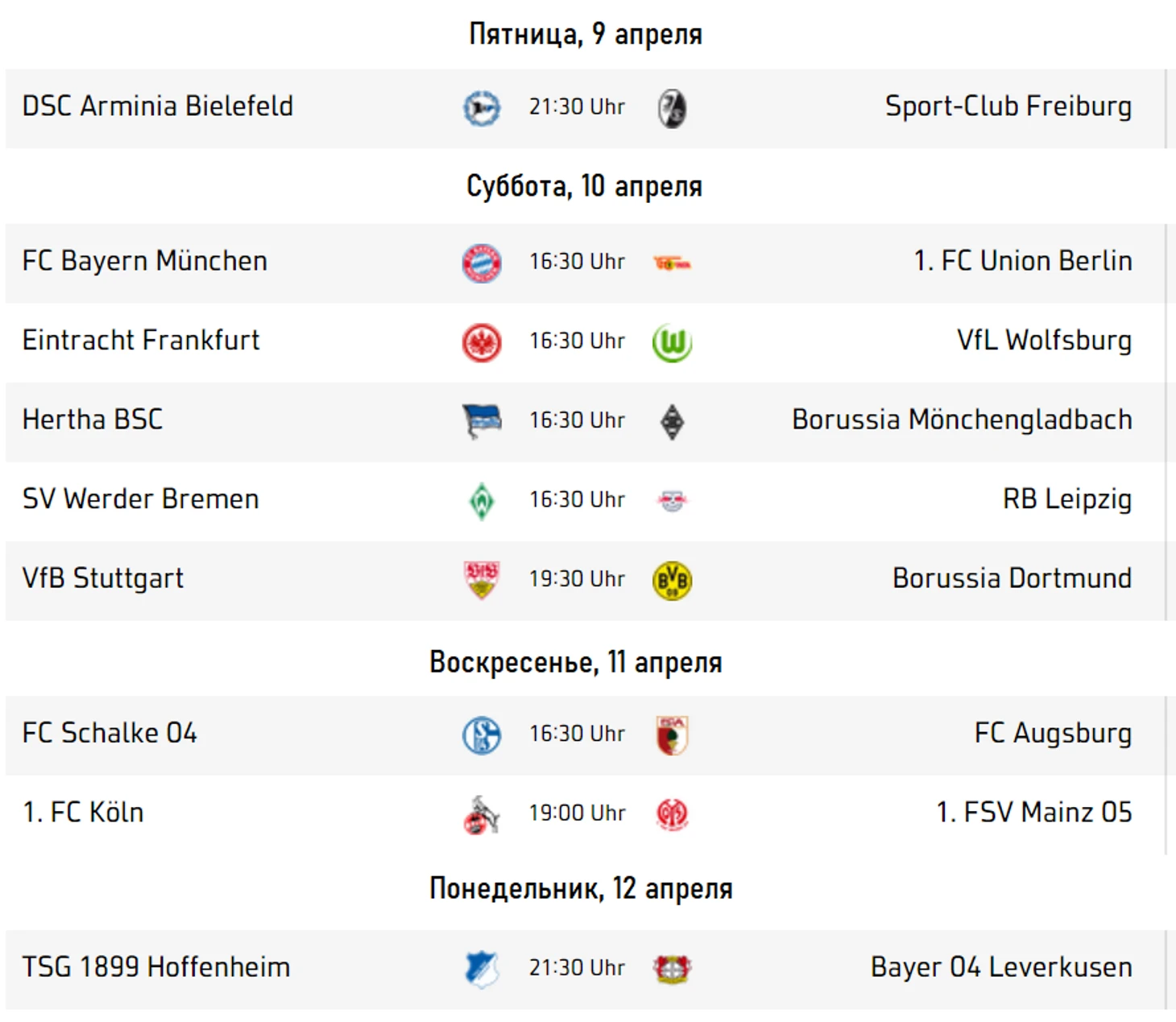 Новая неделя – новый тур. В 28-й игровой день ждем интересных противостояний между претендентами на Лигу чемпионов «Айнтрахтом» и «Вольфсбургом», а так же между «Кёльном» и «Майнцем» из подвала таблицы. «Боруссия» Дортмунд попытается реабилитироваться за поражение от «Штутгарта» в первом круге, а сами «швабы» попробуют забраться в еврокубки. «РБ Лейпциг», не смотря ни на что, продолжит преследовать «Баварию», а мюнхенцы постараются не оступиться в матче с «Унионом» из Берлина. В понедельник тур завершат «Хоффенхайм» и «Байер».