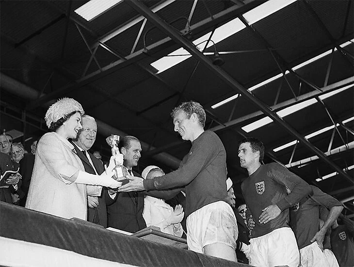 Вот вместе с королевой Елизаветой награждает футбольную сборную Англии на ЧМ-1966.