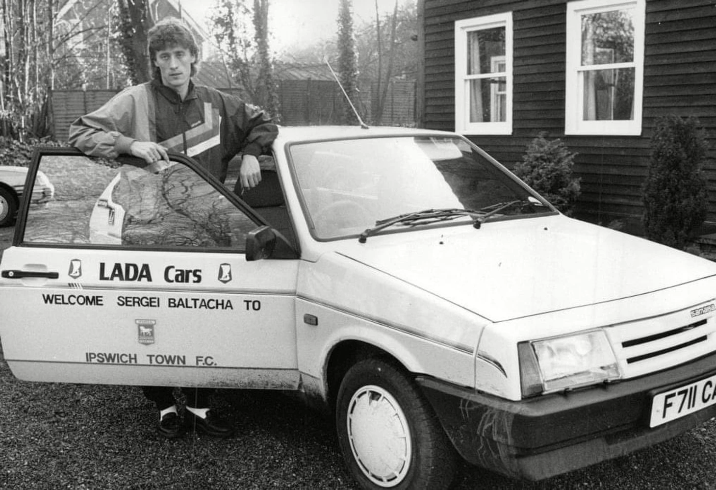 Экс-полузащитник киевского "Динамо" и новобранец "Ипсвич Таун" Сергей Балтача с подарком от руководства клуба - новенькой праворульной "восьмеркой", 1988 г.