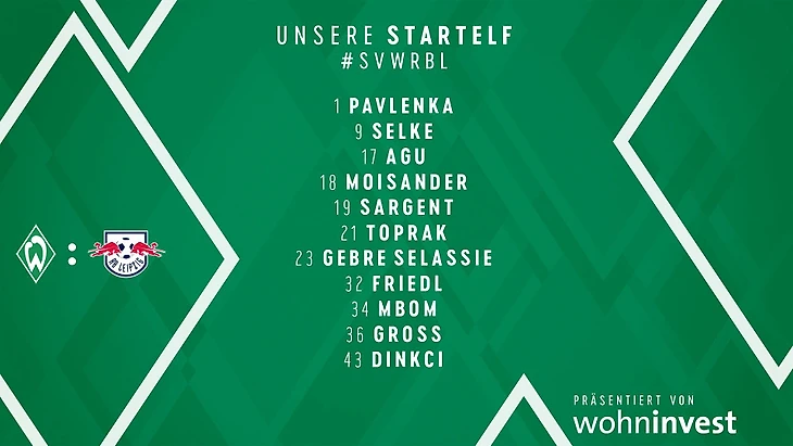 Практически с первых минут «Лейпциг» забрал мяч и не собирался отдавать его сопернику. Правда, и опасных моментов в их исполнении было крайне мало. В то время, как «Лейпциг» показывал тотальное преимущество по владению мячом, «Вердер» лидировал лишь в графе «фолы». Ближе к середине тайма игроки Бремена чуть оживились, но на 24-ой минуте «быки» разыграли отличную комбинацию, и Ольмо открыл счёт в матче — 0:1.