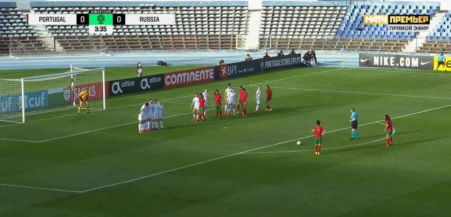 А что у наших ворот? В первые 20 минут было немного тревожно. Уже на 4-й капитан Клаудиа Нету (ожидаемо самый опасный игрок португальской команды) сама заработала и сама пробила штрафной метров с восемнадцати. Повезло - чуть выше перекладины.