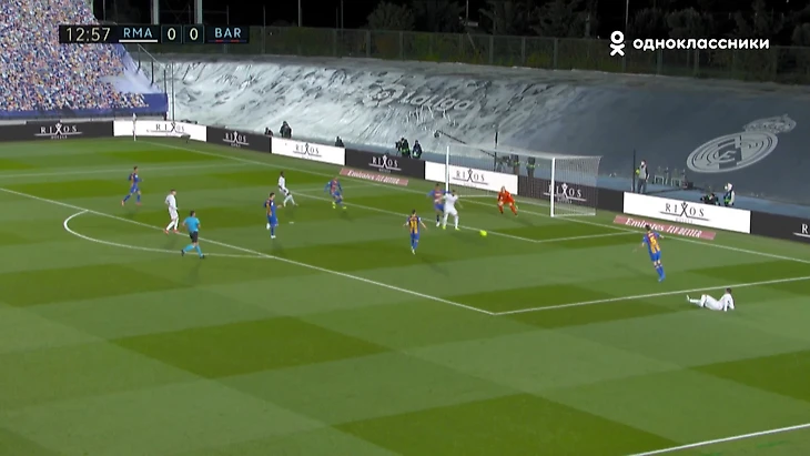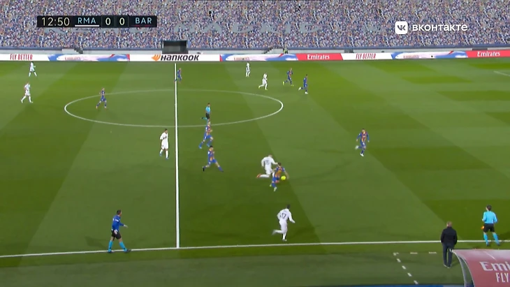 На тринадцатой минуте после недолгого розыгрыша пятнадцатый номер сливочных увидел перед собой свободное пространство и, будучи футболистом быстрым и крепким, смело понёсся вперёд. Медлительные Педри и Бускетс не успели сместиться в эту зону, поэтому встречать уругвайца вышел Жорди Альба. Но опытный испанец сыграл очень неуверенно, и Вальверде с лёгкостью прокинул мяч вперёд. В это время по правой бровке параллельным курсом бежит Лукас Васкес – он только и ждал момента, когда Альба ошибётся и подарит сливочным шанс на опасную атаку через правый фланг.