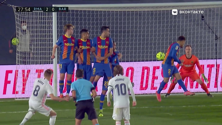 Это был один их худших матчей американца в сезоне, если не худший. У него самая низкая оценка в команде и самая низкая точность передач – 78%. Ниже только у Брэйтуэйта – у него вообще нет передач. Дест располагался, как и Альба, очень высоко. Почти на уровне Месси. Чего делать категорически нельзя, когда перед тобой Модрич, а за твоей спиной Винисиус. Тем более, что никакой остроты от Сержиньо вообще не было - по нему внимательно играл не уступающий американцу в скорости и превосходящий его по физической мощи Менди. В итоге «Барселона» получила несколько опаснейших контратак, вылившихся в голевой штрафной и штангу от Вальверде под занавес тайма. Отдельно можно поговорить об игре Деста при штрафном Кросса. Почему Сержиньо стоял отдельно от стенки? Перекрывал дальнюю штангу? Тогда почему он уворачивался от мяча, когда чётко видел, что снаряд летит прямо в него? В итоге мяч срезался в ближний угол и ни забежавший туда Альба, ни дернувшийся по изначальной траектории мяча Тер Штеген уже ничего не могли сделать. «Реал» удвоил преимущество.