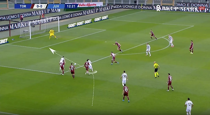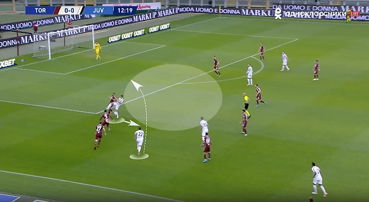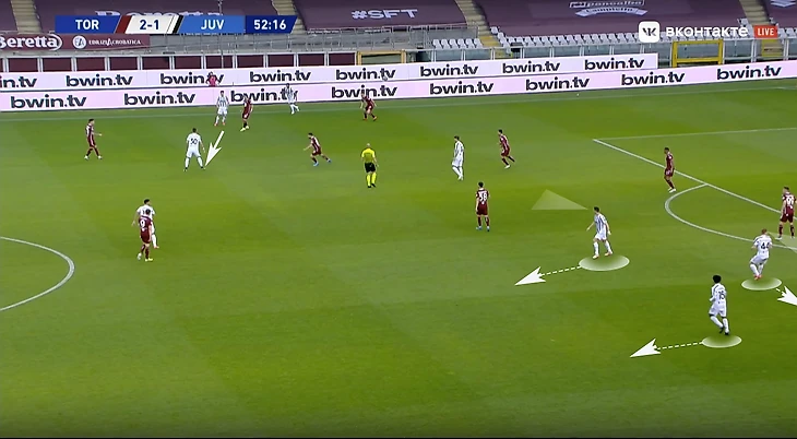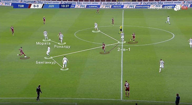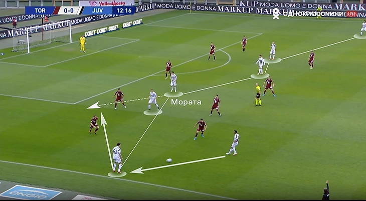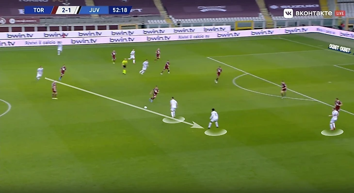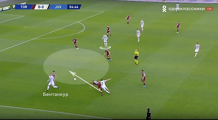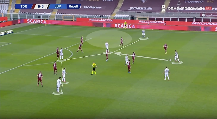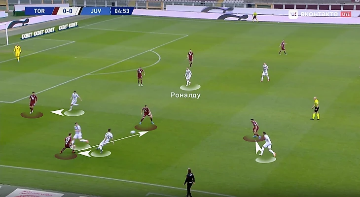 При игре против такого соперника важно грамотно создавать и заполнять пространство. Рассмотрим ситуацию из первого тайма туринского дерби:
