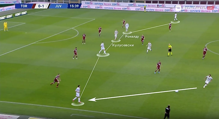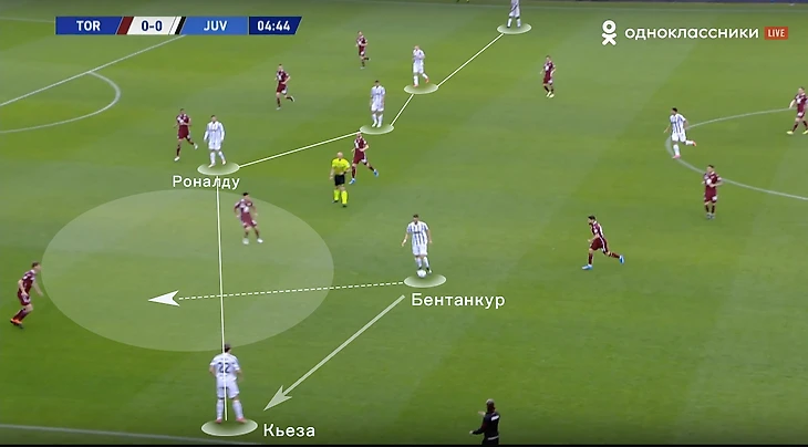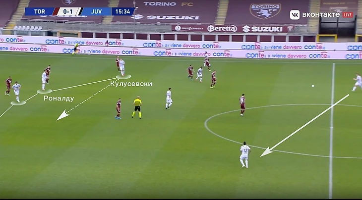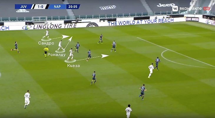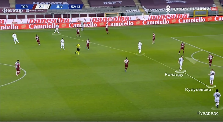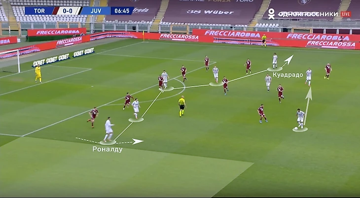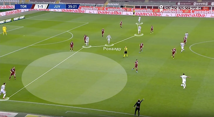 Еще одна важная деталь – большинство атак строились вокруг Криштиану. Пирло отошел от идеи позиционной игры, при которой важно заполнение всех вертикальных каналов в атаке. Если Рон сваливался во фланг, под него сразу подстраивались партнеры, создавая перегруз. После чего чаще всего следовал перевод под изоляцию, португалец в это время успевал заполнить штрафную площадь. Так и был организован первый гол в матче: