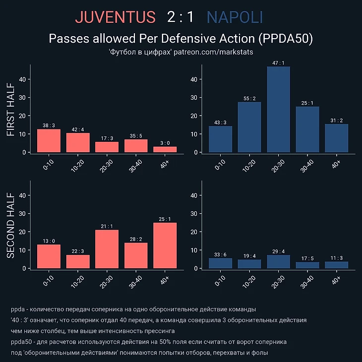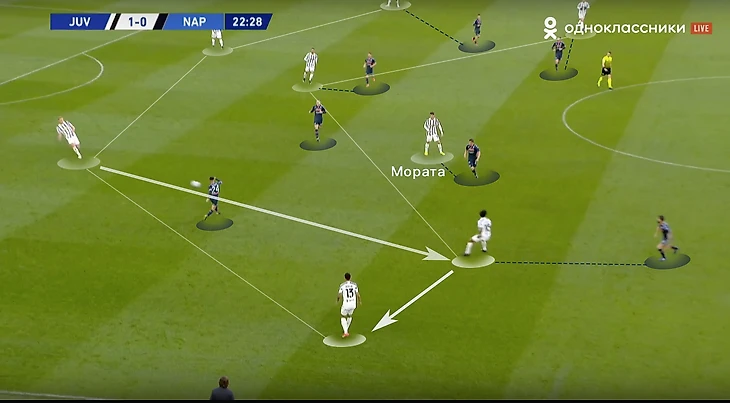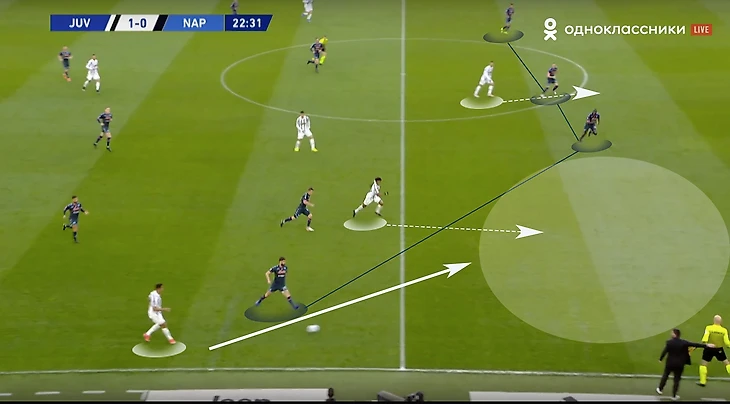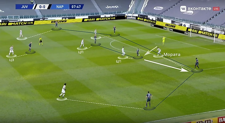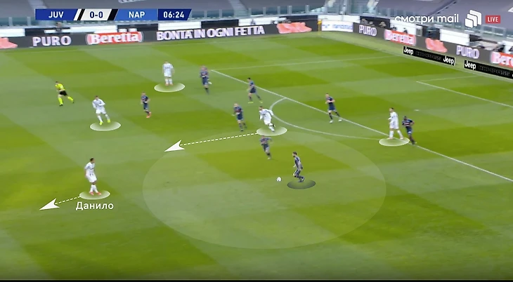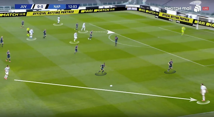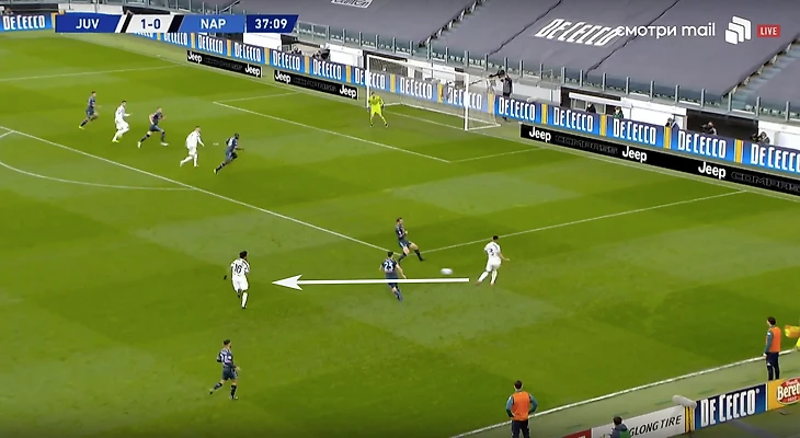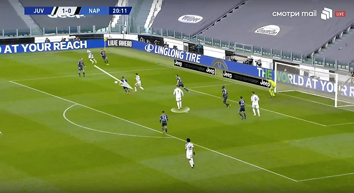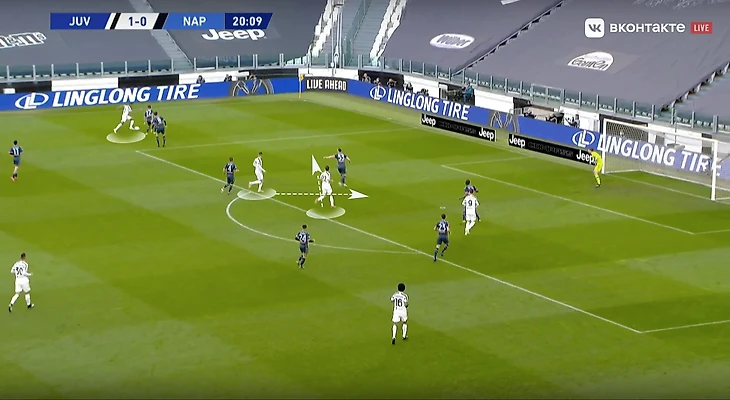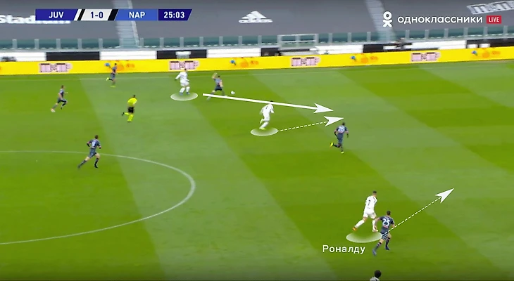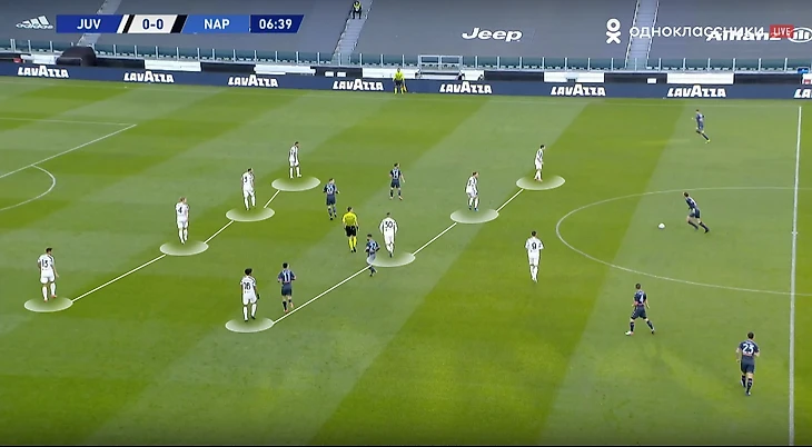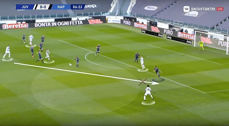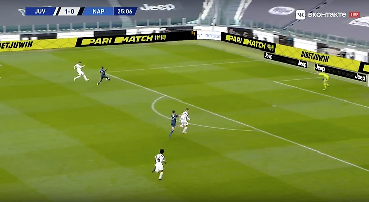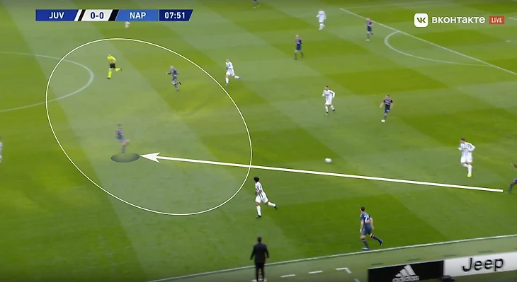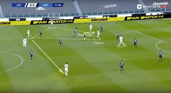 Скажем еще пару слов про игру «Старой синьоры» без мяча. В стадии прессинга сложнее всего подстроиться под пассивность португальца. И конкретно в этом матче панацеи придумано не было (да и есть ли она?). Хозяева старались запирать неаполитанцев на флангах. Помимо этого, большой объём беговой работы ложился на центральных полузащитников и защитников «Ювентуса». Первые плотно играли по хавбекам соперника, часто очень высоко поднимаясь за ними вплоть до чужой штрафной, а вторые должны были соблюдать компактность и страховать большую зону за спинами Бентанкура и Рабьо.
