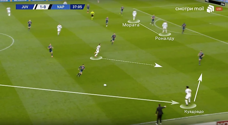 А вот развитие той же атаки и пример создания ширины от Куадрадо (колумбиец начал движение еще на иллюстрации выше) на противоположном фланге: