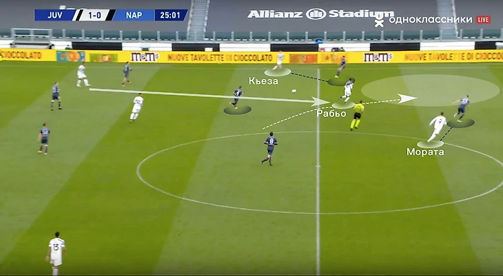 С левого фланга ширину создавал Кьеза, а полуфланг атаковал Рабьо (он отлично ищет и заполняет подобные зоны, когда пас идет ему на ход):