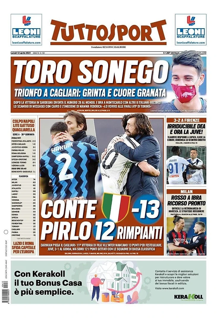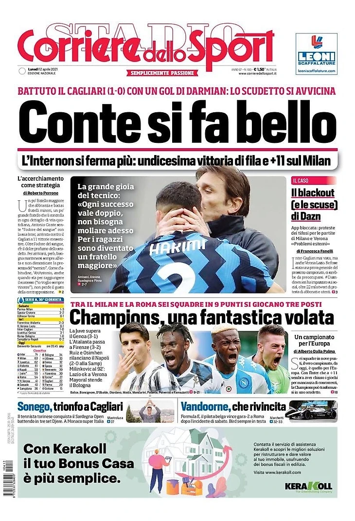 Конте делает красиво. Заголовки Gazzetta, TuttoSport и Corriere за 12 апреля