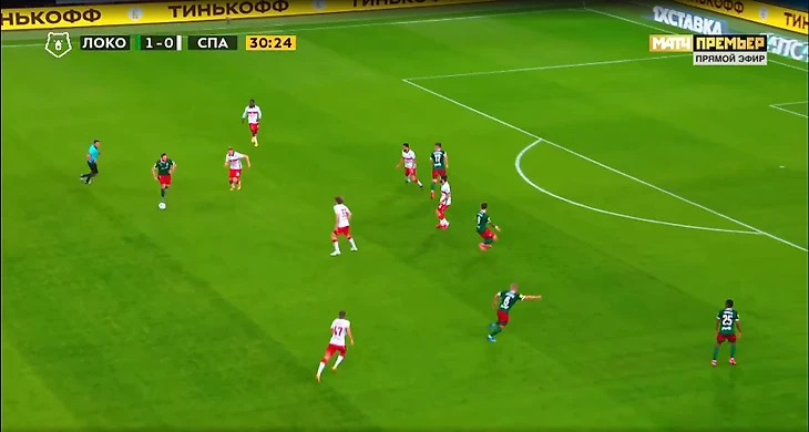 Отметим, что «Локо» пытался обороняться зонально, не разбирая игроков «Спартака» индивидуально, что выглядит логичным – тот же Соболев любит опускаться ниже для борьбы за верховые передачи, Ларссон и Промес любят совершать смены позиций и смещаться в зоны, и всё это дополняется активными латералями, за которых поочередно могли отвечать либо две «восьмёрки» (Баринов и Крыховяк), либо крайние защитники.