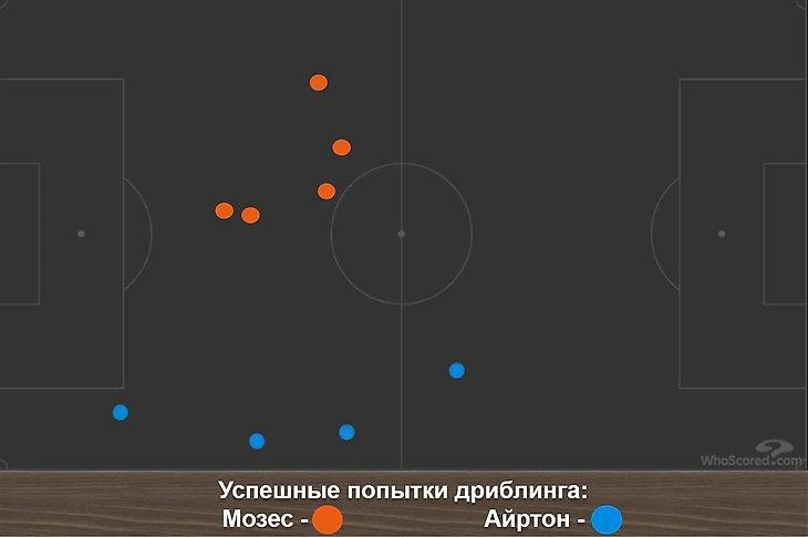 На правом фланге "Спартака" нечто подобное вытворял Мозес (5 успешных обводок - лучший показатель в игре), с тем лишь отличием, что он предпочитал сужать пространство, смещаясь в середину.