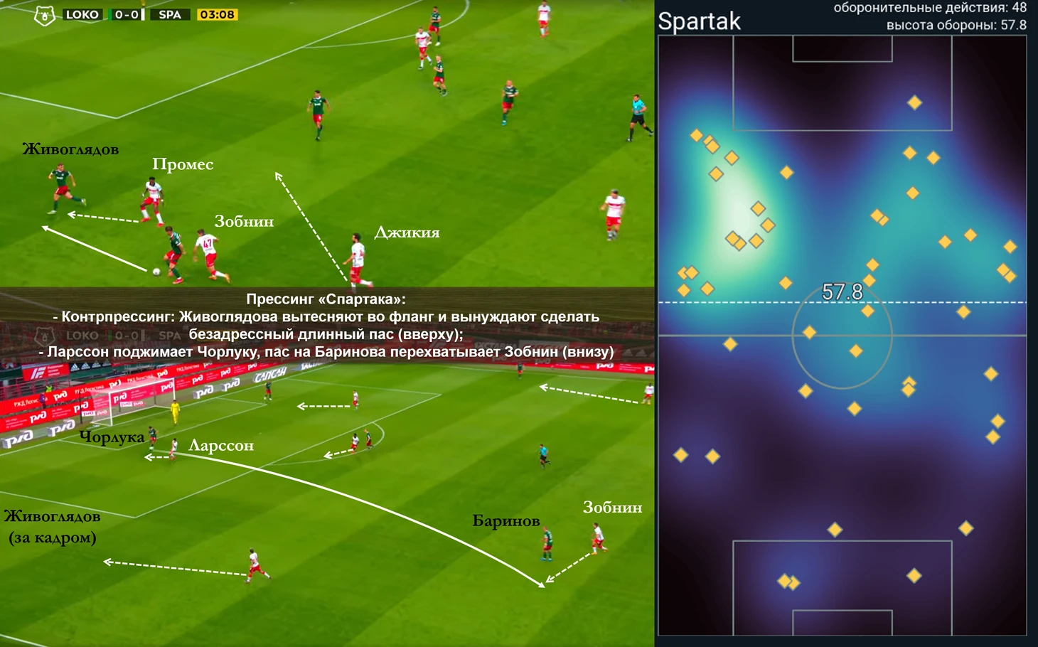 Подобная тактика требовала от игроков "Спартака" высокой интенсивности и, с учётом группы атаки "Локо", практически безошибочной игры в середине поля, где большая нагрузка ложилась на Крала и Зобнина. В итоге, если прессинг красно-белых проваливался, в центре у них появлялось огромное пространство, в котором свободно себя чувствовал, в первую очередь, Жемалетдинов.