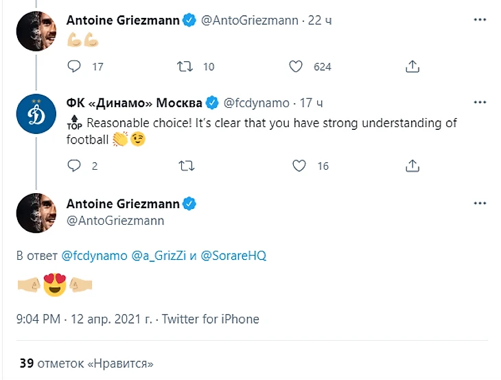 Под твитом, где сообщалось о покупке карточки 17-летнего хавбека, Гризманн даже пообщался с «Динамо». «Разумный выбор! Понятно, что вы хорошо разбираетесь в футболе», – написал московский клуб. Француз ответил довольным эмодзи.