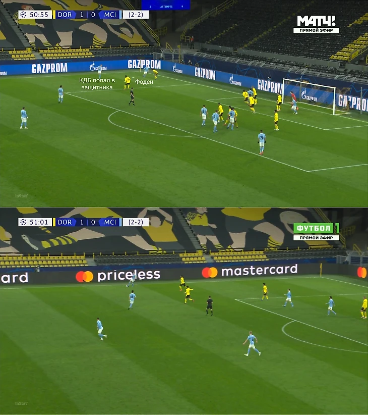 После этого «Сити» мгновенно бросился в новую атаку и в 20 метрах от ворот сразу оказались 9 полевых «Боруссии». Холанд, естественно, отрезан от команды.