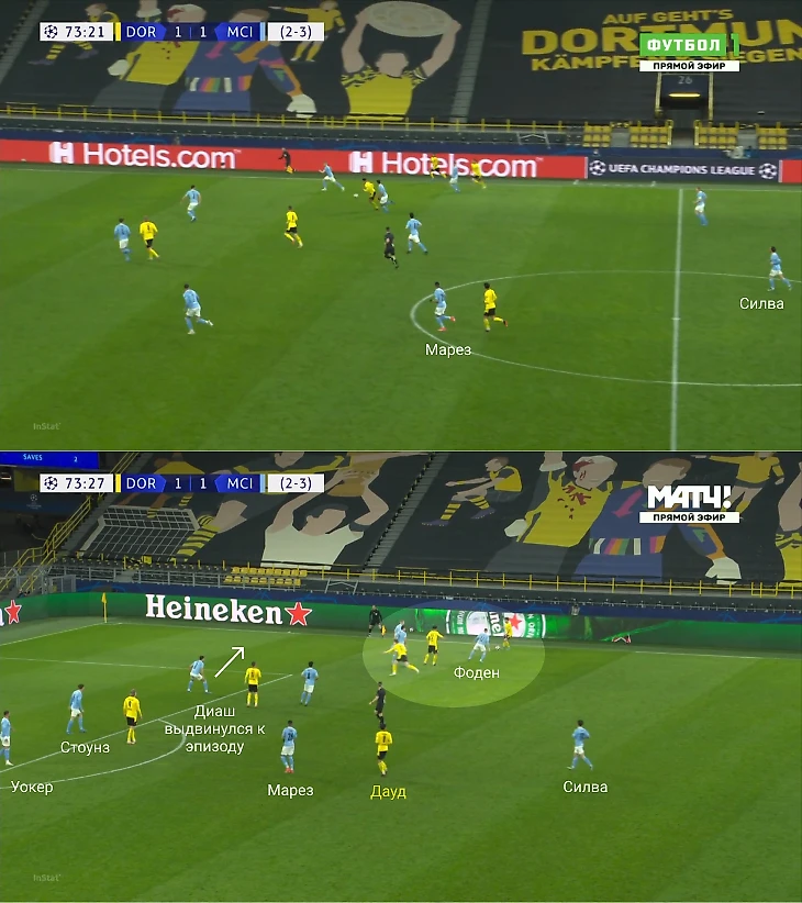Дальше «Сити» поджал количеством: на фланге была ситуация 3-в-3 + страховал Диаш, а в его зоне был Гюндоган (не откликнулся на рывок игрока «Дортмунда, но по ходу эпизода доиграл к штрафной) + Марез откатился в свободную зону. По сути, даже если бы Зинченко не перехватил мяч, у «Боруссии» мало шансов на перспективную атаку – в штрафной против Холанда Стоунз и Уокер (Диаш мешал бы подаче), а около опорной зоны Марез и Силва против Дауда.