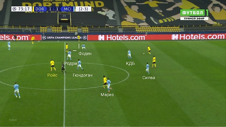 Конкретный пример: «Сити» прессинговал линейными 4-4-2. Де Брюйне и Бернарду играли по центральным защитникам, Марез и Фоден закрывали фланги, а Гюндоган и Родри разбирали центр. В такой ситуации у «Боруссии» могло быть 3-в-2 в центре поля (Силва прессинговал с КДБ), но из-за активного давления Джан создавал ситуативную тройку в первой фазе. Пространство заполнял Ройс, уходя с фланга, но здесь важна дисциплина Фодена и Мареза: зачастую при владении в центре они занимали полуфланги. Так закрывались вертикальные коридоры + «Сити» выманивал «Боруссию» на фланге, где зажимал количеством.