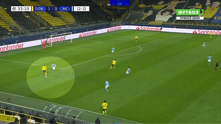 После перехвата Кевин разогнал атаку, а «Сити» вжал «Боруссию» в штрафную (исходя из счета, хозяева были не против). Из-за этого Эрлинг Холанд отрезан от всей команды – почти нереально удержать мяч под давлением нескольких игроков «Сити», которые откатились назад.
